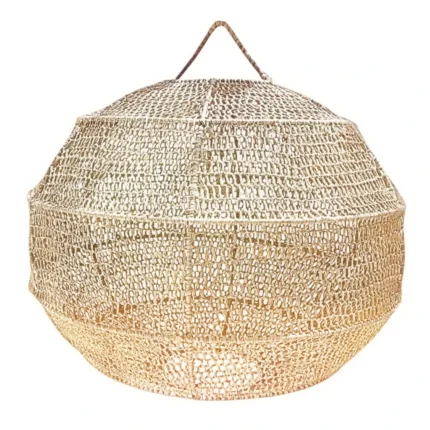 Preisspanne: €11.00 bis €20.00Handgefertigter, geknoteter Palmseil-Anhänger mit offenem Netzdesign. Handgewebter Lampenschirm aus geflochtener Kordel in Goldtönen. 3 Größen: 30 cm, 40 cm, 50 cm Durchmesser.