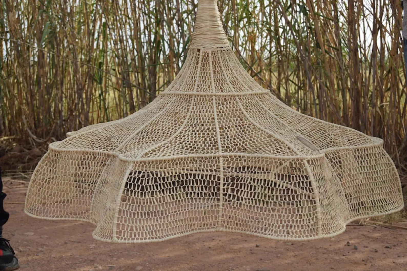 Espectacular lámpara de araña de ala ancha con esqueleto de hierro y malla de rafia tejida. Colgante en forma de platillo con bordes festoneados. Tamaños personalizados disponibles.
