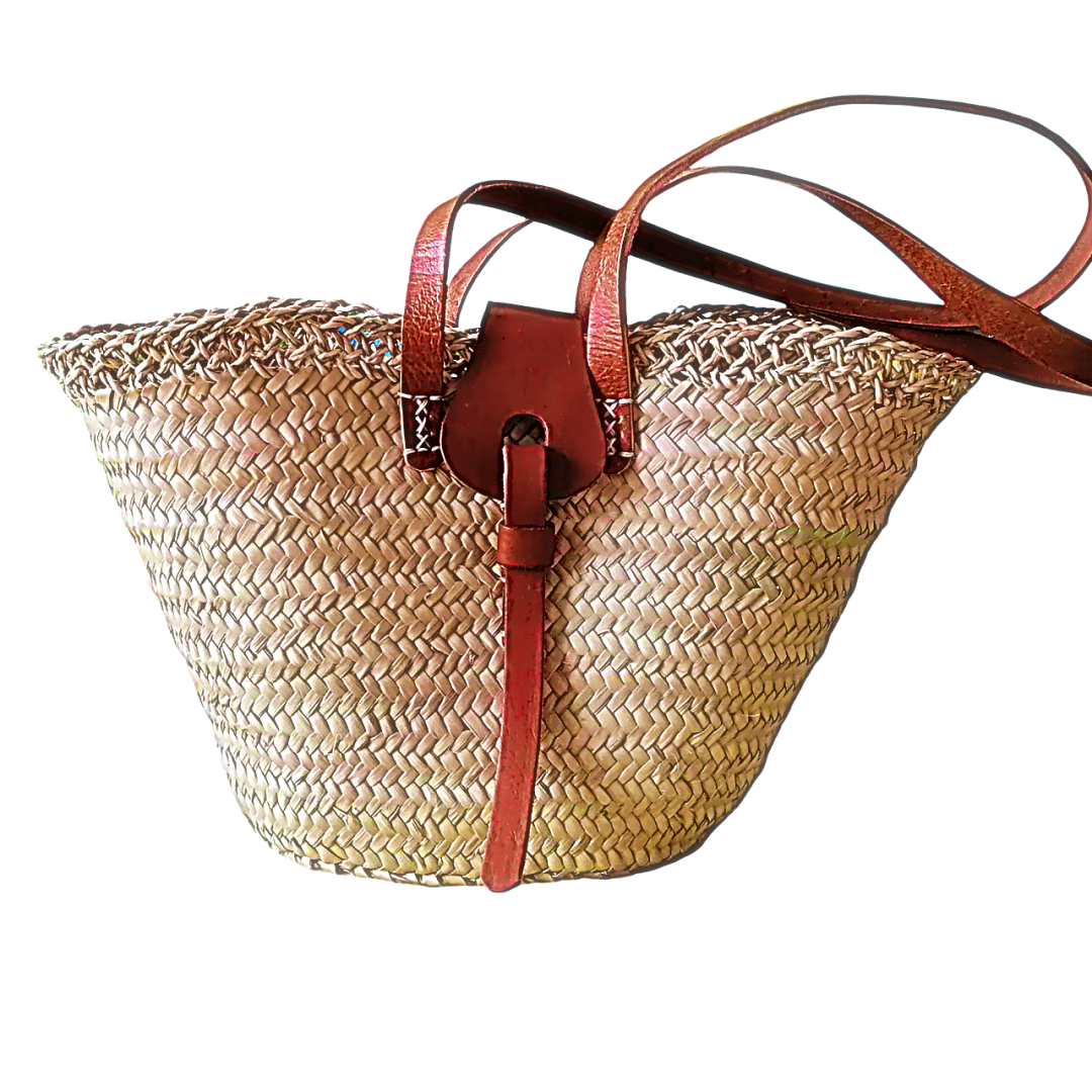 Cestino di paglia marocchino fatto a mano con bordo in rete e manici in pelle – Borsa da mercato foderata