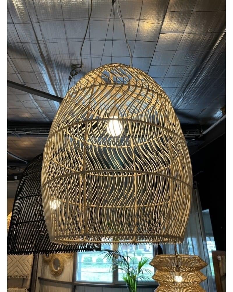 Porta calore organico al tuo spazio con la nostra lampada a sospensione a cupola in vimini fatta a mano: un paralume a forma di alveare splendidamente realizzato con tradizionale tessitura a fasce orizzontali. La struttura in rattan naturale filtra la luce attraverso motivi intricati, creando magia ambientale.